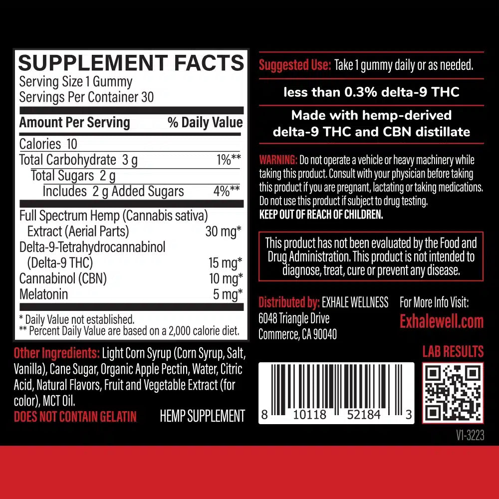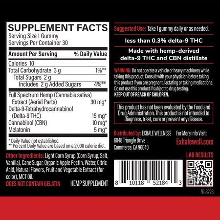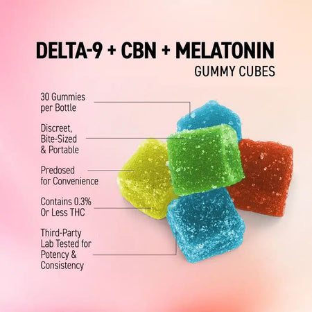 - 15mg THC, 10mg CBN & 5mg Melatonin per Gummy