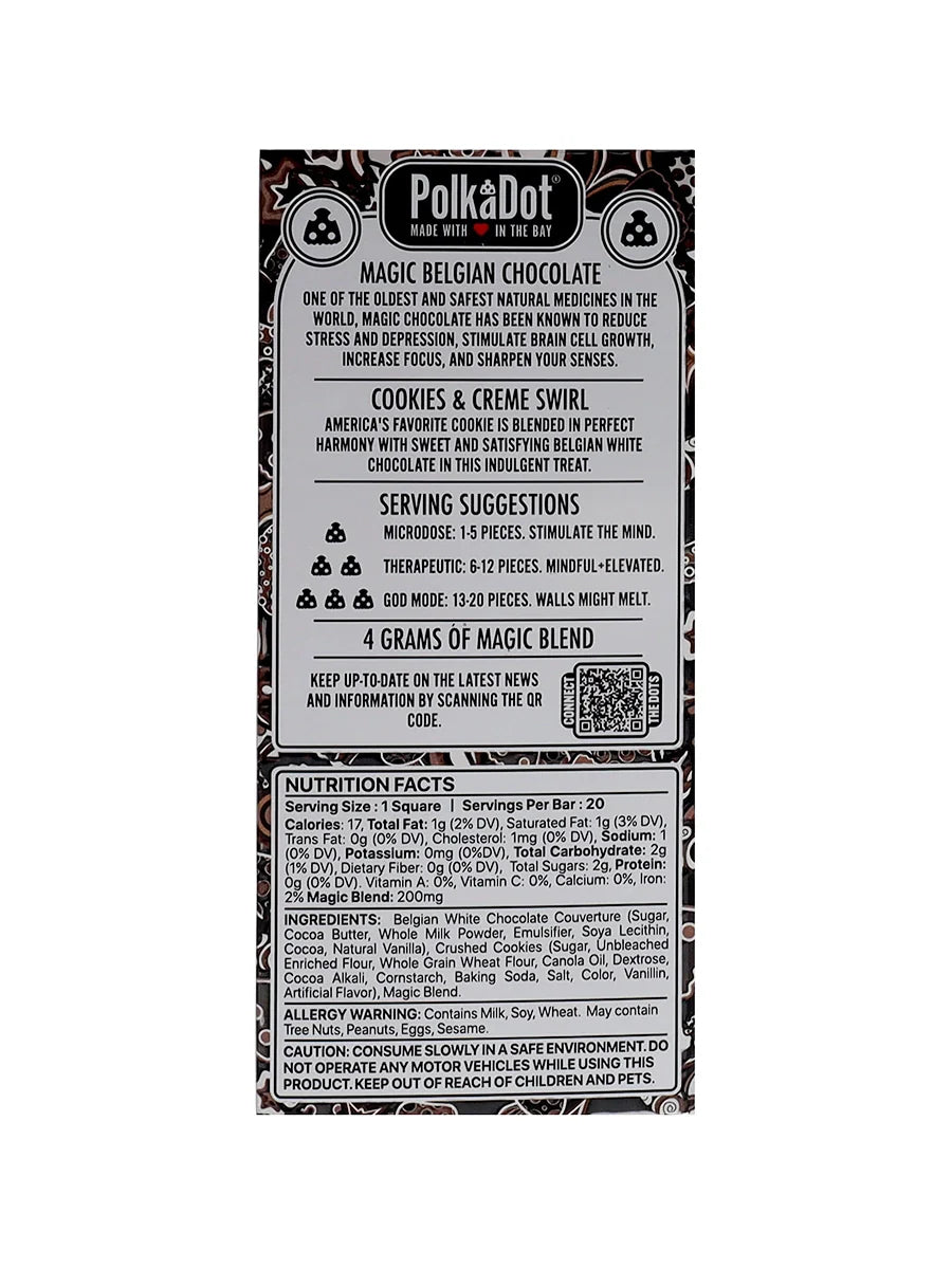 Treat yourself to the ultimate indulgence with Cookies & Creme Swirl PolkaDot Magic Mushroom Belgian White Chocolate 200mg Magic Per Piece. Delight in the velvety smoothness of white chocolate swirled with chunks of classic cookies and cream. Each bite offers a perfect balance of creamy sweetness and satisfying crunch, making it a truly irresistible treat for any occasion.