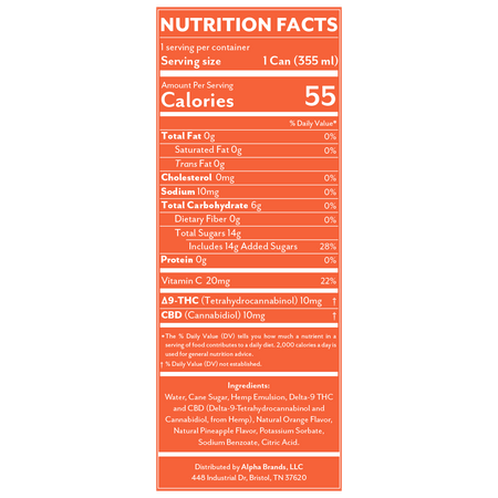 Tropical pineapple and zesty orange blend on the citrusy, sun drenched THC seltzer. Having a 1:1 ratio of Delta 9 THC and CBD, Pineapple Orange gets you sailing off to an airy, even keel high just in time for beach trips, backyard BBQs, or whenever you want to sip pure tropical nirvana.