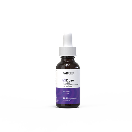 Unplug, unwind, and drift off naturally with FAB CBD Doze THC Oil. This dreamy blend combines 25mg Full-Spectrum CBD, 1.25mg Delta-9 THC distillate, and 5mg CBN isolate per serving — the perfect trio to quiet your mind, relax your body, and help you ease into deep, restorative sleep.*