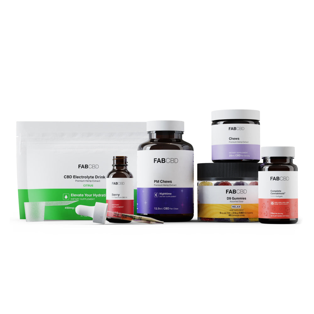 It includes the Complete Cannabinoid Softgels, Assorted Sour D9 Gummies, Berry CBD Tincture 1200mg, Anytime Gummies, Sleep Gummies, and CBD Drink Mix.
