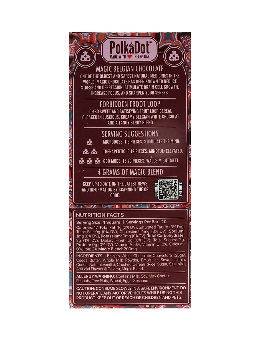 Embark on a nostalgic journey with Forbidden Froot Loop PolkaDot Magic Mushroom Belgian White Chocolate 200mg Magic Per Piece. Experience the playful crunch of fruity froot loops intertwined with the creamy richness of Belgian white chocolate. With every bite, reminisce about carefree childhood days while savoring the unique and whimsical flavor combination.