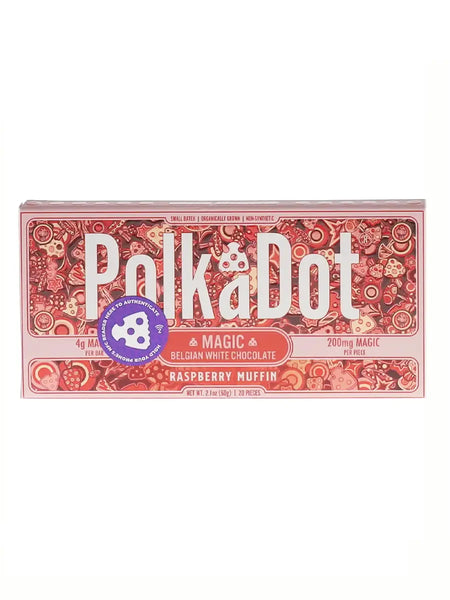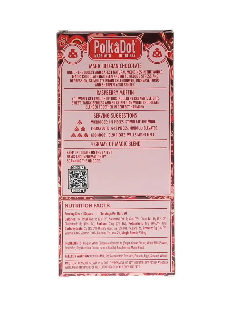 Introducing the Raspberry Muffin PolkaDot Magic Mushroom Belgian White Chocolate, a tantalizing blend of sweet raspberries, fluffy muffin bits, and the subtle allure of magic mushrooms. Each piece is infused with 200mg of magic mushrooms, offering a delightful and enchanting experience with every indulgent bite.