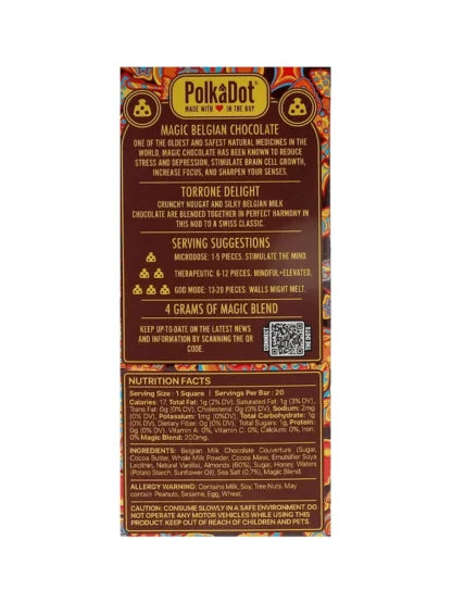 Transport yourself to the streets of Italy with this delightful confection. Crunchy almonds and sweet honey nougat are enrobed in velvety Belgian milk chocolate, creating a delightful texture and flavor contrast that's reminiscent of traditional torrone. Torrone Delight PolkaDot Magic Mushroom Belgian Milk Chocolate 200mg Magic Per Piece is a taste of European elegance in every bite, perfect for those who appreciate the finer things in life.